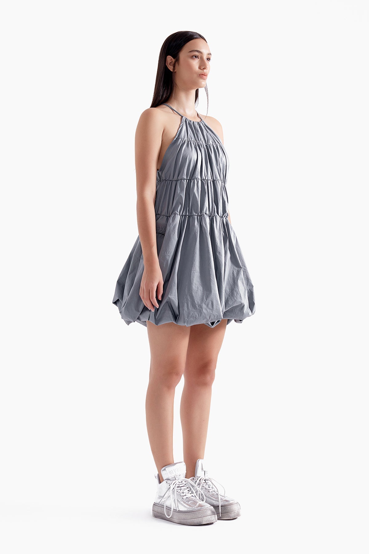 The Aeris Bubble Mini Dress captures lightness, movement, and modern edge.
