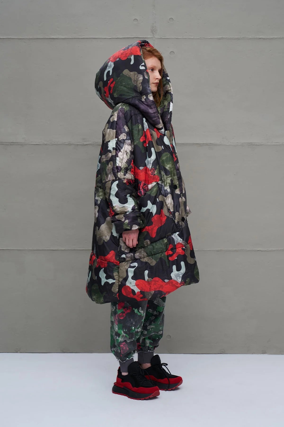 The oversized silhouette, lightweight padded warmth and adjustable hood give urban protection for the cold season. Inside, the functional elastic shoulder straps allow you to wear the jacket hands-free when temperatures rise, turning your coat into a statement accessory while you move.