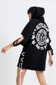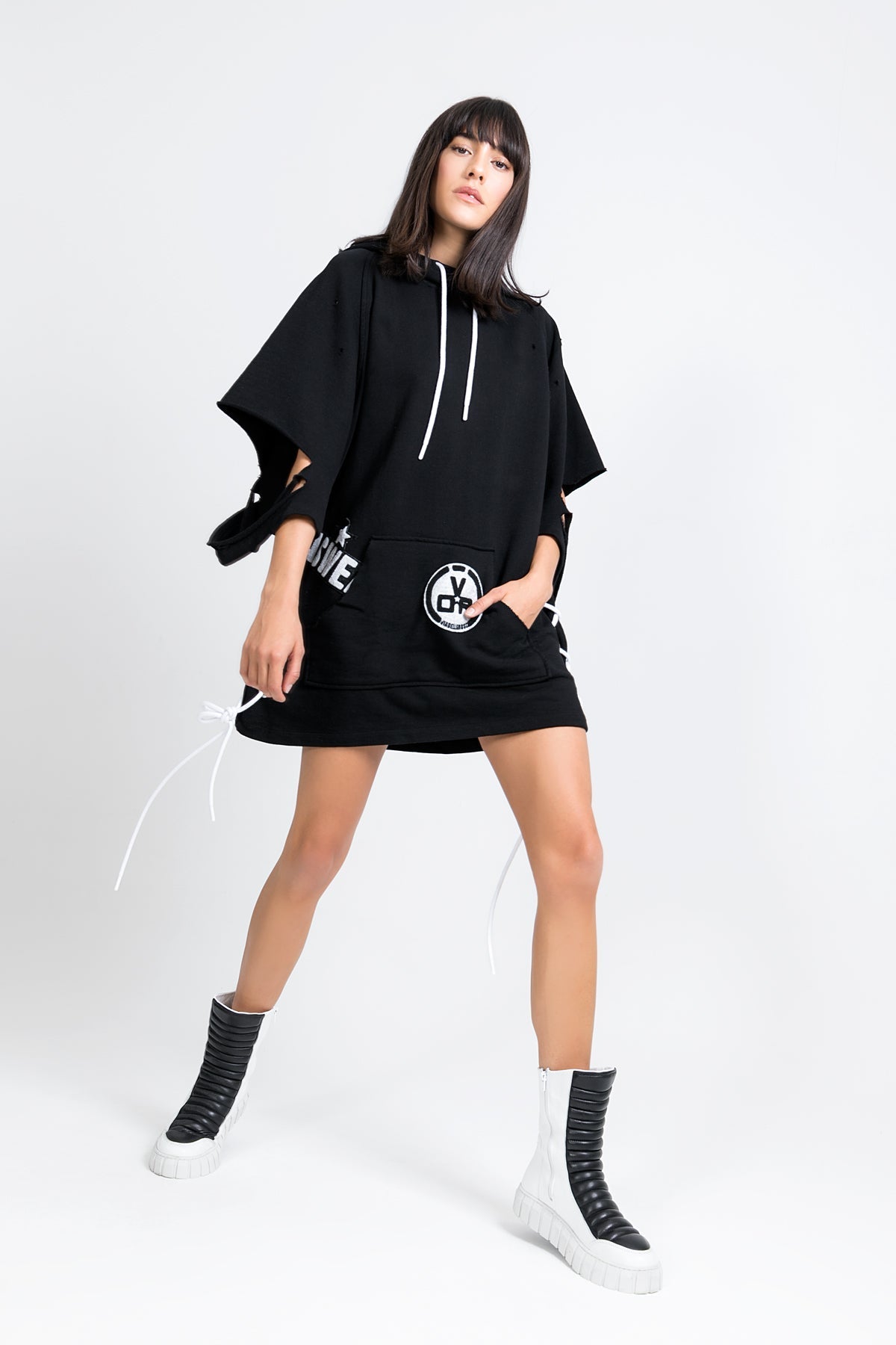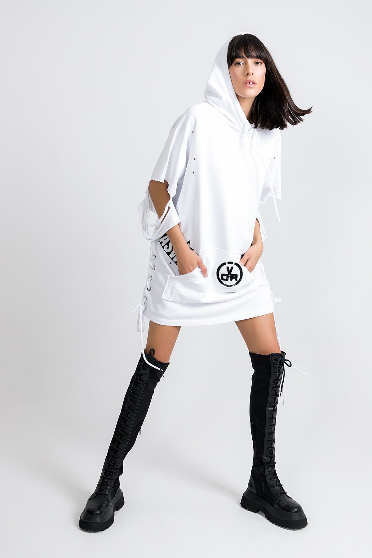 Crafted from 100% premium cotton, this oversized hoodie-dress features raw distressed cut-outs, lace-up side details, and the iconic Dare To Be graphic print on the back — a declaration of attitude for those who refuse to blend in.