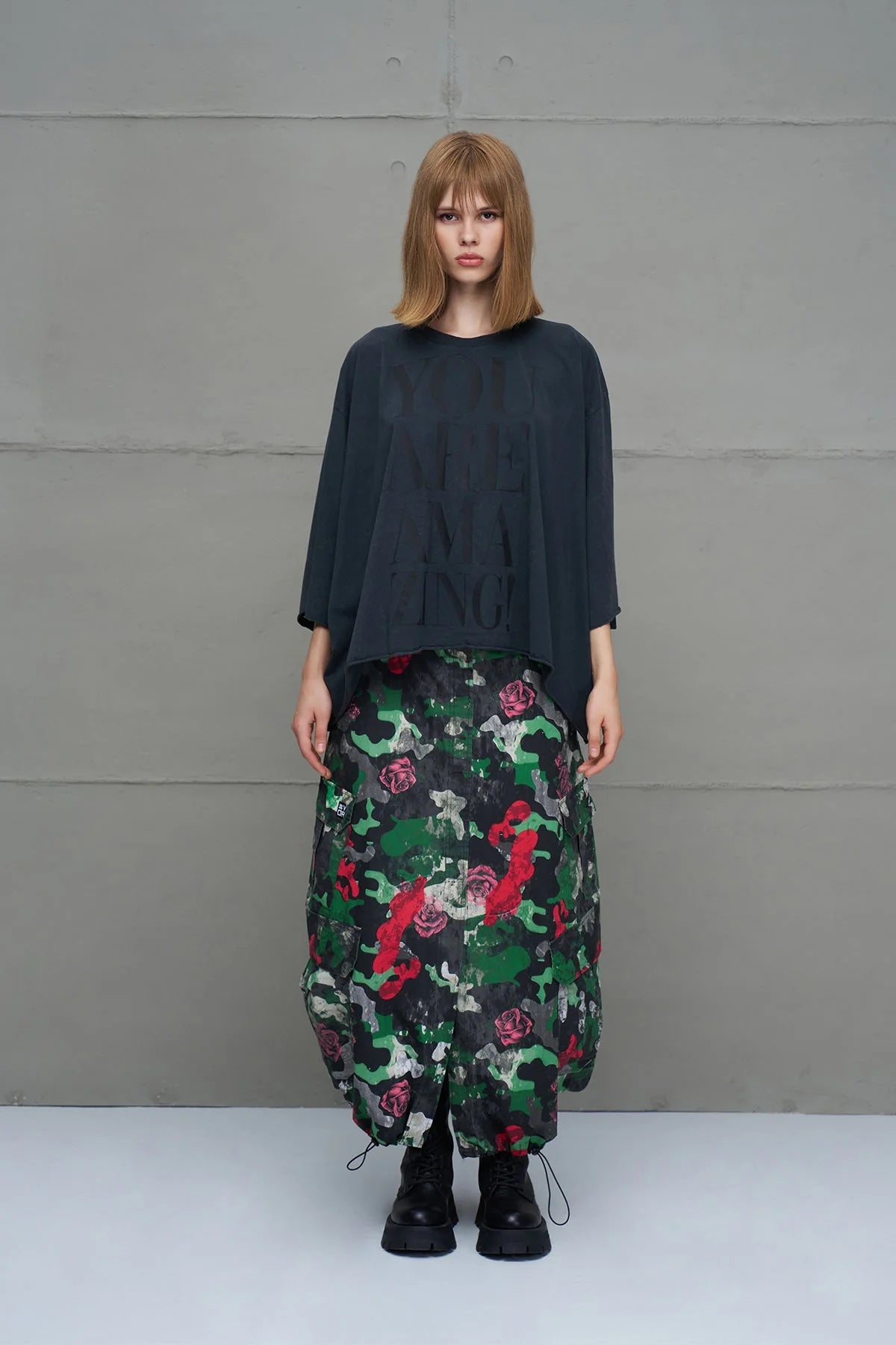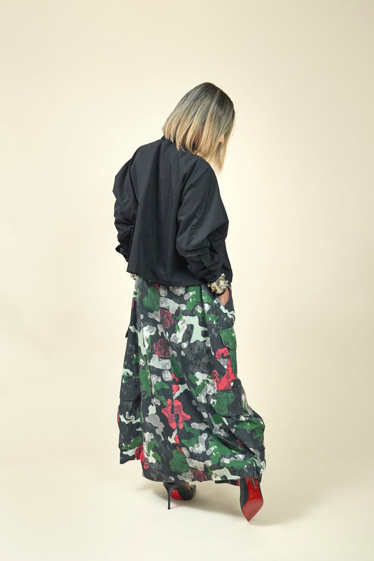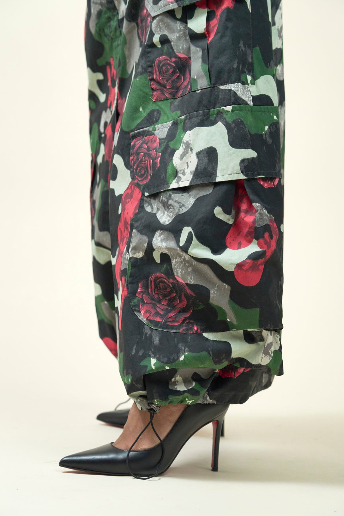 This statement piece mixes original camouflage art with floral rebellion. Designed for movement and confidence, it features bold cargo pockets, adjustable drawstrings, and the iconic Via Delle Rose label on the back. The print brings power, attitude, and personality to every step. Pair it with your favorite oversized tee or a cropped bomber and take your look from casual to unstoppable.