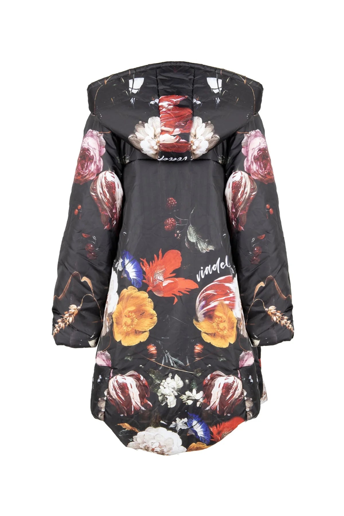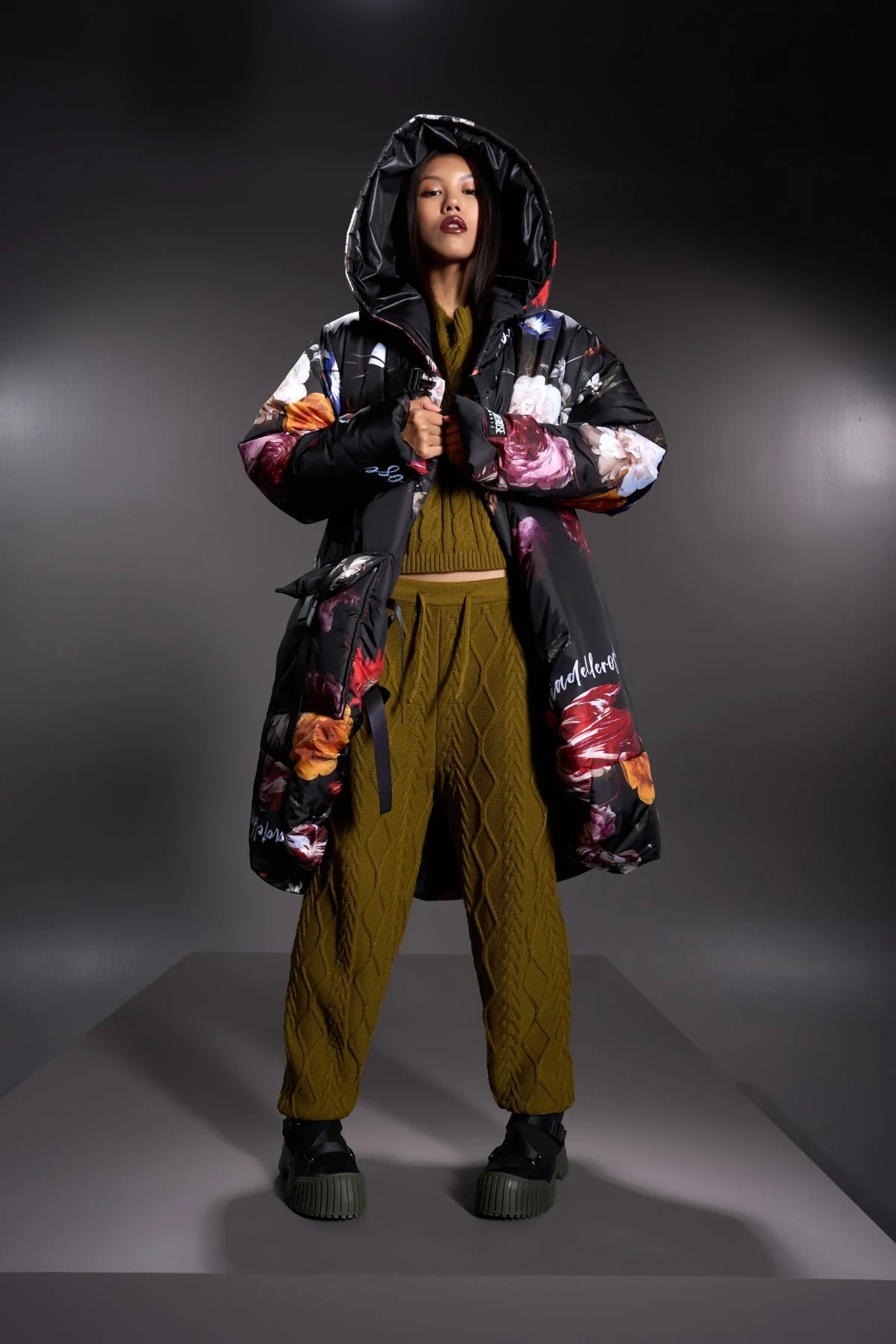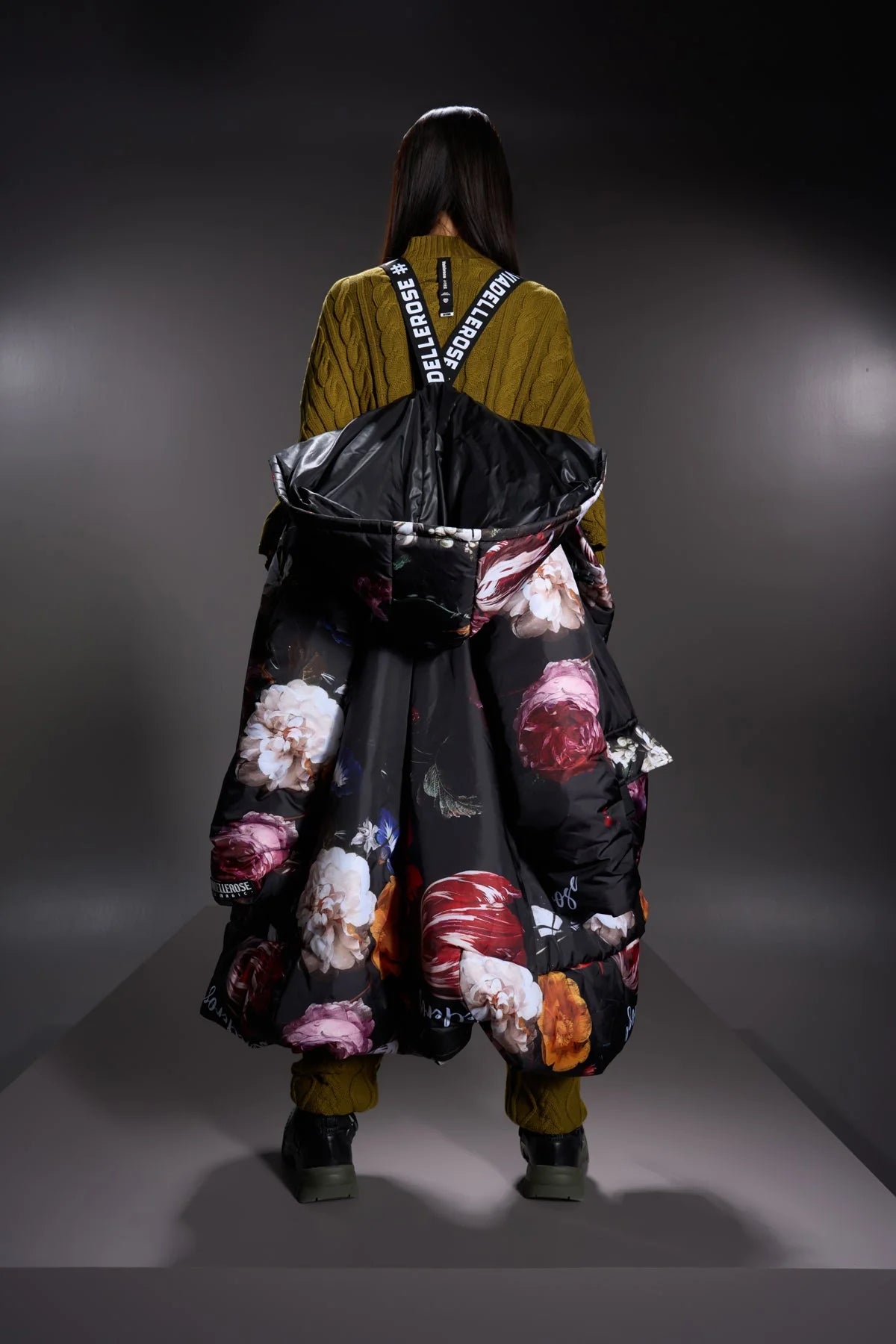 The Night Bloomer Puffer is an oversized statement coat printed with dramatic florals across deep noir black. Italian Design it delivers lightweight warmth with an edgy high-volume silhouette.