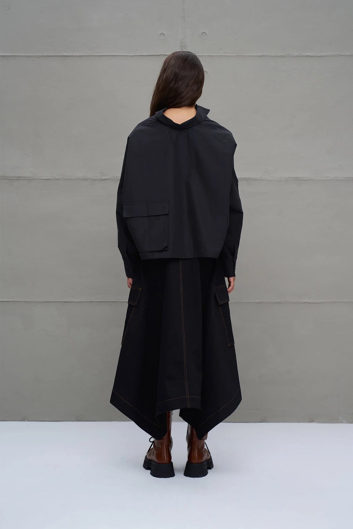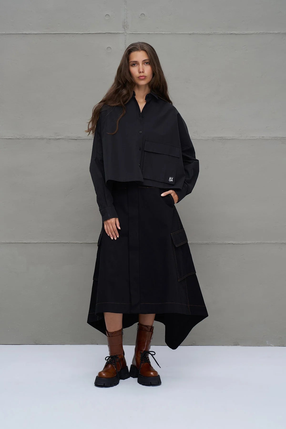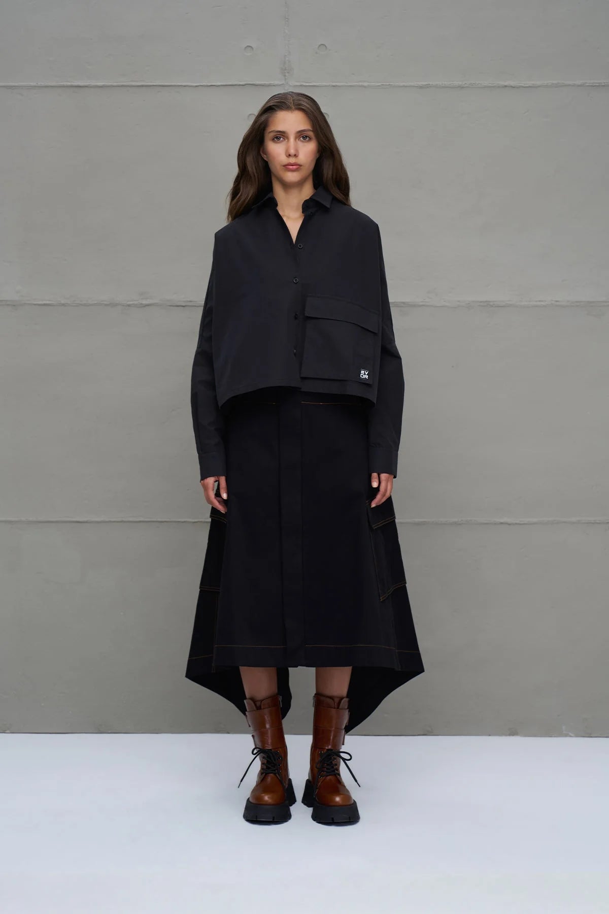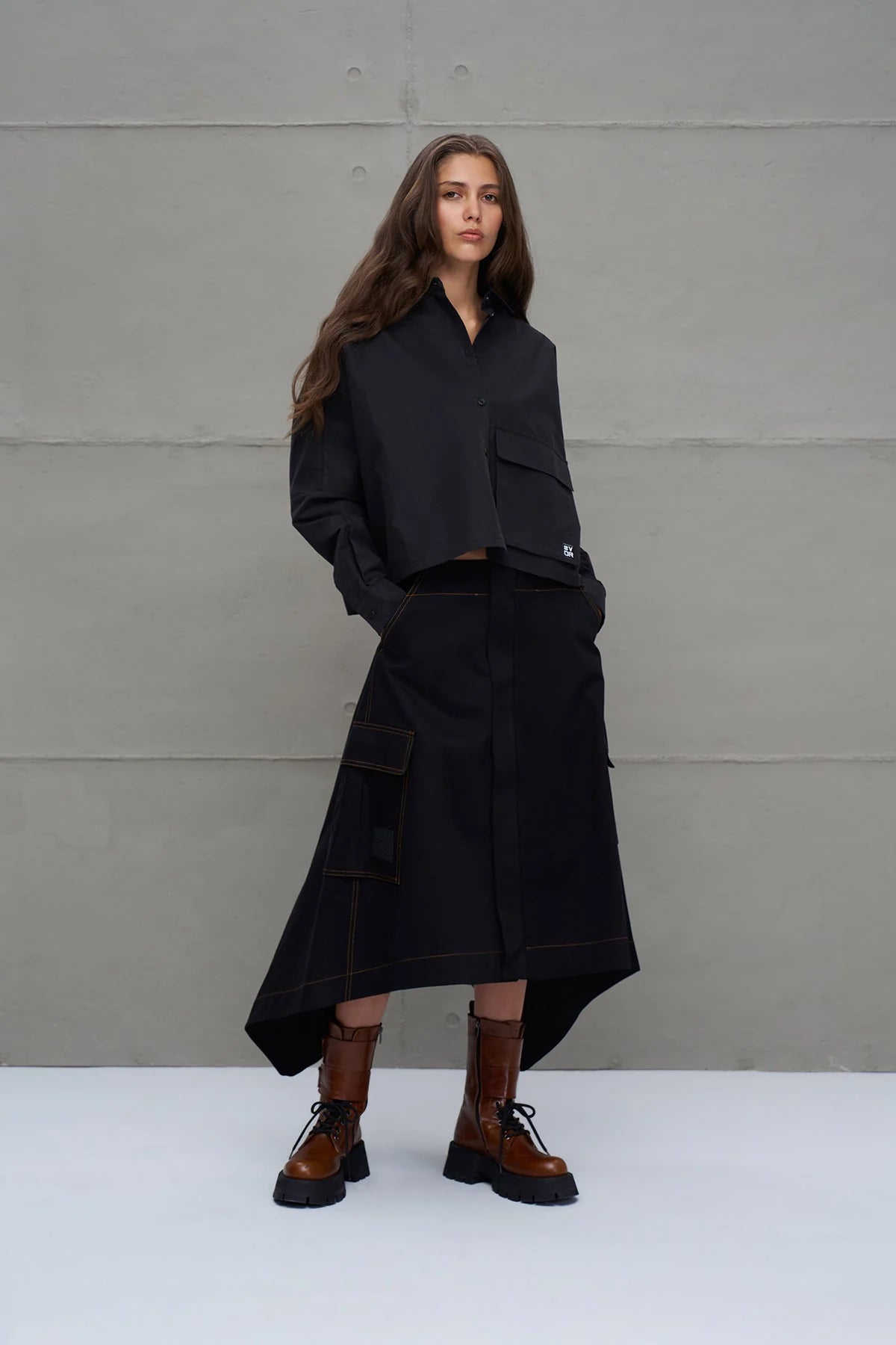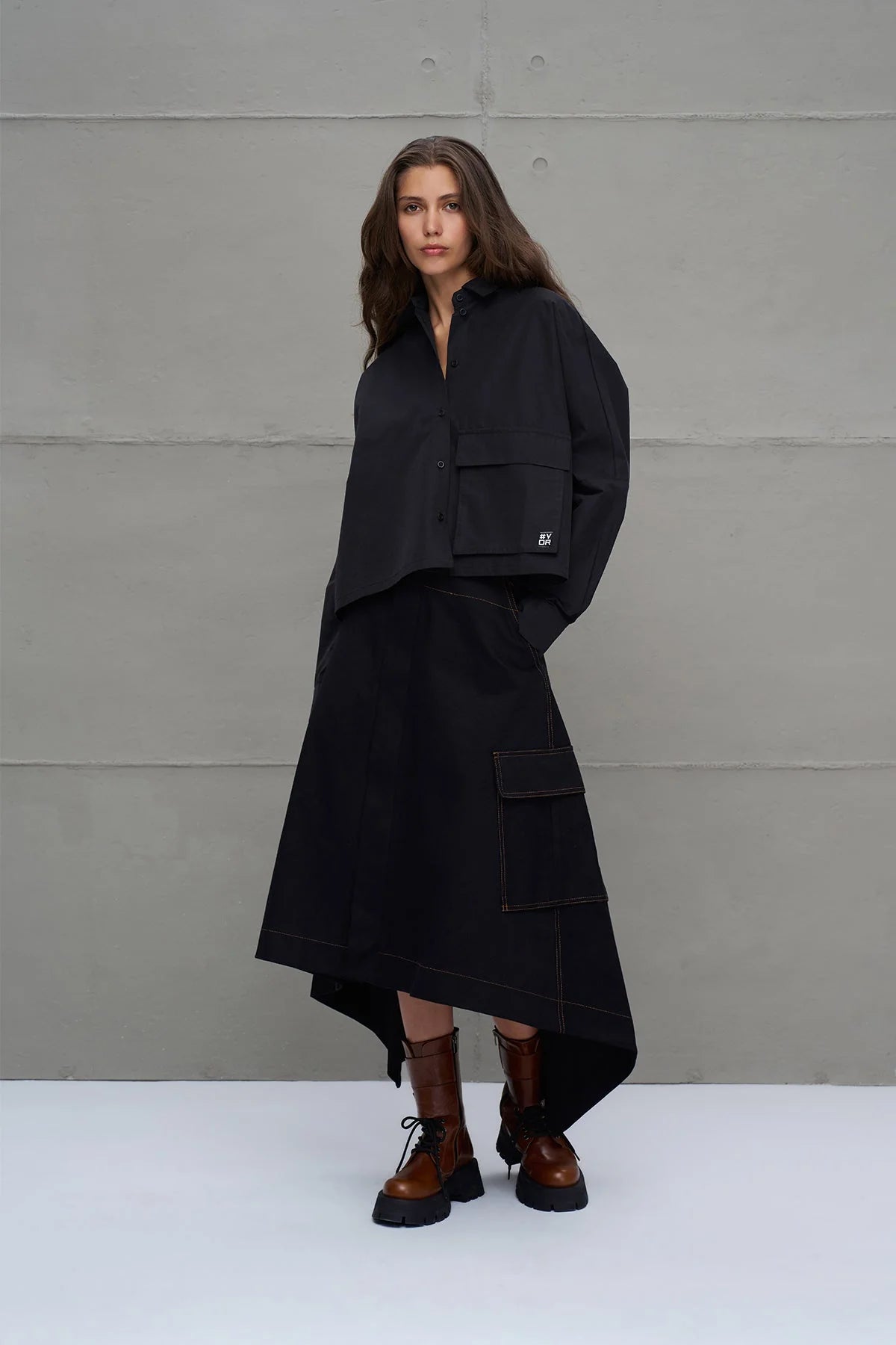 The cropped boxy fit pairs with exaggerated sleeves and a statement oversized flap pocket,a signature detail that takes a classic button-down into full streetwear territory. Effortless to layer or style on its own, it’s your new go to for day to night looks.