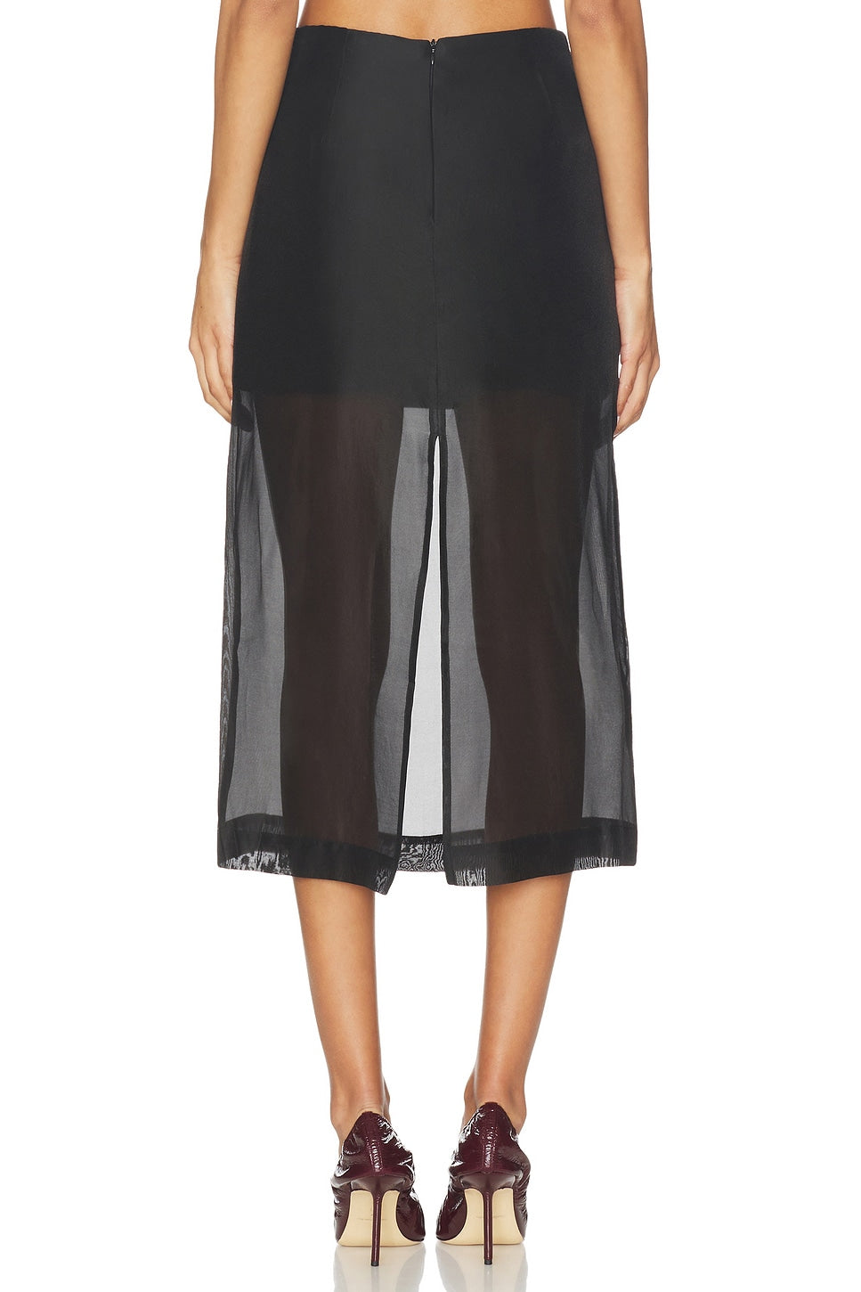 transparent lower length, creating subtle movement and understated sensuality. Minimal in construction yet visually striking, the skirt is conceived to layer effortlessly with tailored separates, statement shirts, or evening silhouettes.